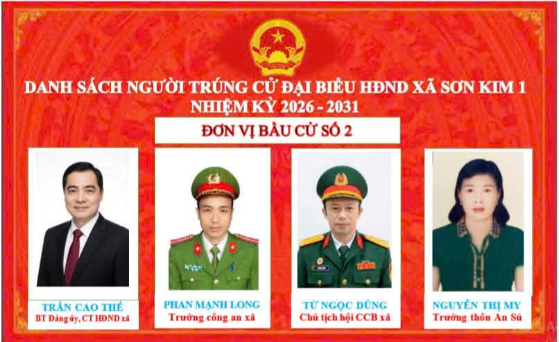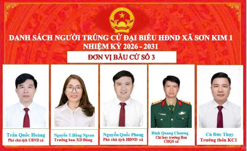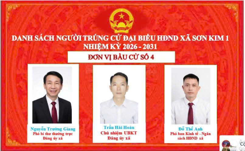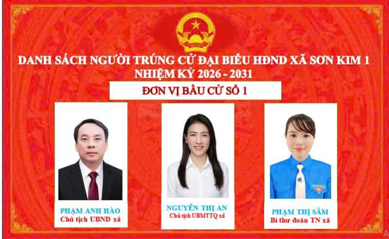 Ngày 19/3/2026, Ủy ban bầu cử xã Sơn Kim 1 đã ban hành Nghị quyết số 04/NQ-UBBC công bố kết quả bầu cử và danh sách những người trúng cử đại biểu Hội đồng nhân dân xã Sơn Kim 1 khóa XXI, nhiệm kỳ 2026 - 2031.
